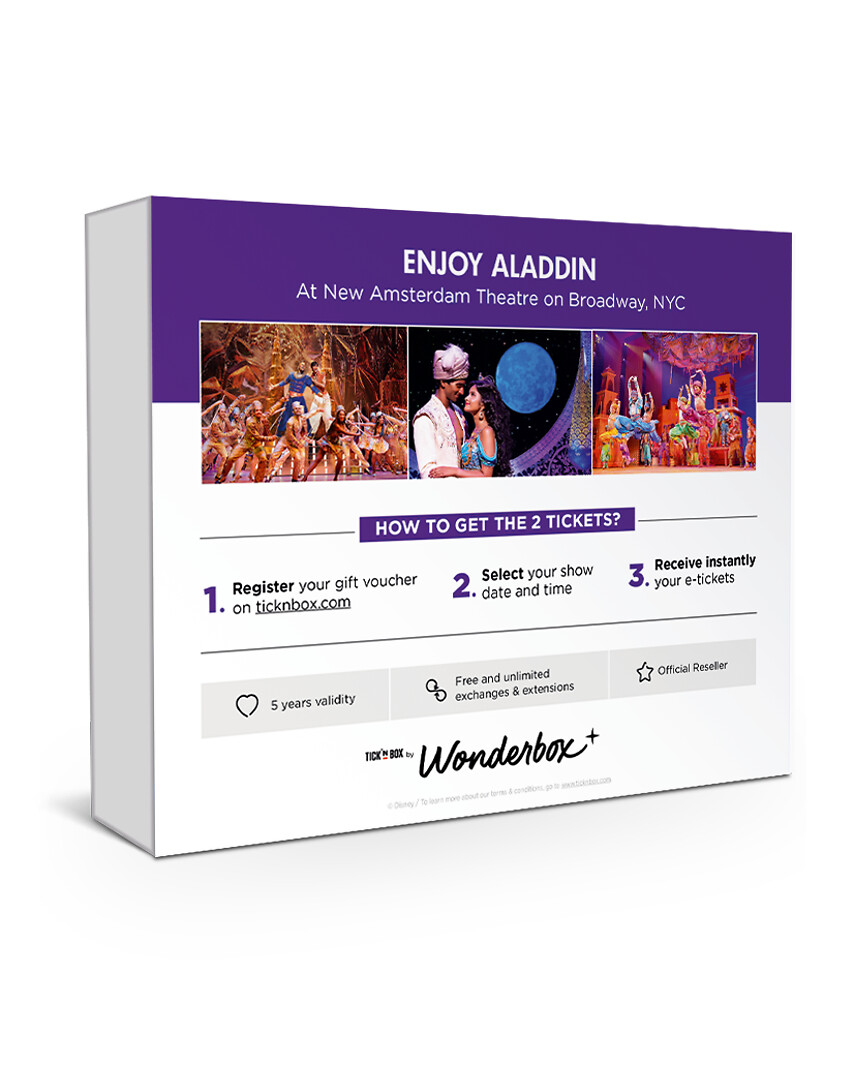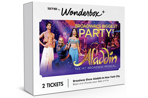 This experience gift includes two tickets and is about sharing the magic of storytelling, the power of live performance, and the joy of spending quality time together. Step into a world of enchantment and adventure with our exclusive Wonderbox gift experience featuring the Broadway musical sensation, Aladdin. Prepare to be transported to the vibrant and mystical city of Agrabah, where magic, love, and destiny intertwine in the most captivating way. Unlock the gateway to a night of unforgettable entertainment as you receive two coveted tickets to the dazzling Aladdin show. The moment you enter the theater, you'll find yourself immersed in a realm of opulent sets, intricate costumes, and breathtaking choreography that breathe life into the beloved tale. As the lights dim and the curtains rise, be prepared to be swept away by the tale of a spirited young man named Aladdin, whose destiny takes an astonishing turn when he discovers a magical lamp containing a wish-granting genie. Join him on his thrilling journey as he embarks on a quest to win the heart of Princess Jasmine and thwart the nefarious plans of the conniving Jafar. The story unfolds through a mesmerizing fusion of music, dance, and exceptional performances that will keep you on the edge of your seat from the first note to the final curtain call. This Wonderbox gift experience isn't just about witnessing a Broadway show; it's about becoming a part of a world where dreams take flight, true love conquers all, and the power of a single wish can change everything. Share this extraordinary journey with a friend, loved one, or fellow theater enthusiast, and create memories that will last a lifetime. Elevate your gifting game and give the gift of enchantment with our Aladdin on Broadway Wonderbox experience. Open the lid to a night of wonder, laughter, and pure theatrical delight as you embark on an adventure that will transport you to the heart of a timeless tale, where wishes come true in the most unexpected ways.