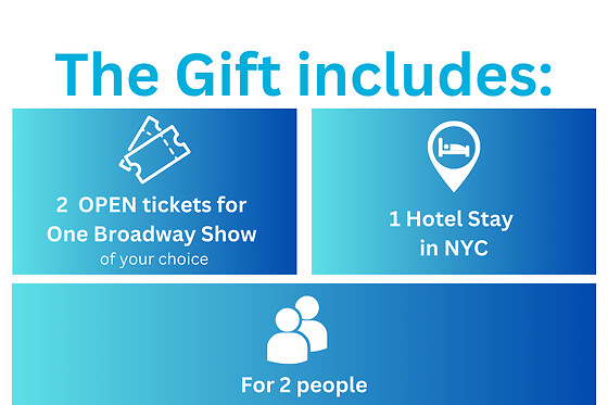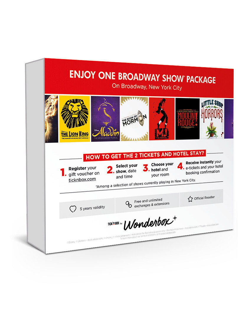 This experience gift includes two tickets for one Broadway show of your choice: The Lion King, MJ, Harry Potter, The Book of Mormon, Aladdin, Six, Wicked...and is about sharing the magic of storytelling, the power of live performance, and the joy of spending quality time together. Elevate your gift-giving to new heights with our Broadway Multi Ticket! Delight your loved ones with an unforgettable experience that seamlessly blends the allure of live theater. We believe in offering you the ultimate flexibility when it comes to enjoying the magic of Broadway. Once you choose your favorite show, date, and time, we offer a variety of sections within the theatre, including the Mezzanine, Orchestra, and other sections depending on the specific venue. Once you've selected your desired section, our system will assign you a seat within that area. Rest assured, we strive to ensure that every seat offers a fantastic view of the stage, so you can immerse yourself fully in the magic of the performance. Immerse yourself in the world of live entertainment as you present two coveted tickets to a Broadway show that will leave you spellbound. Feel the excitement rise as the curtains part to reveal a world of wonder, laughter, and drama. Whether it's the enchanting melodies of a classic musical or the gripping performances of a captivating play, the stage comes alive with stories that resonate long after the final bow. Be transported into a realm of dreams as you witness the artistry and dedication of the performers who bring each character to life. Marvel at the intricate set designs, the spellbinding choreography, and the powerful emotions that reverberate through the theater. The magic of Broadway is an experience like no other, and these tickets promise a front-row seat to the extraordinary. Rekindle the highlights of the performance, share stories of the night, or simply savor the moment in the embrace of luxury. With our Broadway Multi Ticket + Hotel Wonderbox, you're not just giving a gift – you're crafting an experience that intertwines the enchantment of theater with the comfort of modern indulgence. It's a symphony of emotions, a fusion of art and relaxation, and a memory that will be cherished for a lifetime.br />