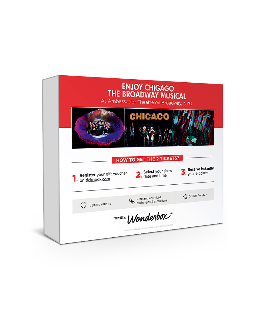This experience gift includes two tickets and is about sharing the magic of storytelling, the power of live performance, and the joy of spending quality time together. Step into the dazzling world of musical theater with our Chicago Musical Wonderbox Gift Experience. Delight in the magic of Broadway as you and a companion are whisked away to the iconic city of Chicago, where the vibrant energy of the stage comes to life in this captivating production. Unwrap the gift of entertainment and elegance as you receive two coveted tickets to the electrifying Broadway show, "Chicago." Prepare to be swept off your feet by the sensational choreography, timeless music, and captivating storyline that have made this musical a true classic. From the moment the curtain rises, you'll find yourself immersed in the sultry and seductive atmosphere of 1920s Chicago, where intrigue, scandal, and show-stopping performances take center stage. As you settle into your seats, the anticipation will build, and the theater's ambiance will envelop you in an aura of excitement. From the grand opening number to the dramatic finale, the exceptional talent of the cast will transport you to a world of glitz, glamour, and unforgettable moments. Our Chicago Musical Wonderbox Gift Experience goes beyond just the show. It's a complete journey, allowing you to make lasting memories with a loved one. Share the thrill of the theater with a friend, family member, or partner and create a night that will be remembered for years to come. Whether you're a seasoned theater enthusiast or a first-time attendee, the Chicago Musical Wonderbox Gift Experience promises an enchanting escape from the ordinary. Revel in the iconic melodies, mesmerizing performances, and the palpable energy of live theater, all while relishing the opportunity to explore the vibrant city of Chicago. Give the gift of an unforgettable night out with our Chicago Musical Wonderbox Gift Experience. Let the allure of the Broadway stage sweep you off your feet and create cherished memories that will be cherished forever!