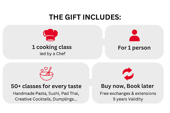 About “Foodie Masterclass” gift: What better gift idea than one you can love, savor… and enjoy again and again? If you're looking for an original surprise for a food enthusiast, a true epicurean, or someone who’s always up for a new experience, the “Foodie Masterclass” gift box is the perfect pick! Designed especially for gourmet lovers, this tasty experience gift brings together the very best cooking classes across the United States. Hands-on lessons with award-winning chefs, pastry workshops, world cuisine discovery sessions, artisanal product making… nothing is left to chance (or left on the plate)! Perfect for a birthday, a special occasion, or just to treat a food lover, this personalized gift box gives the lucky recipient a flavorful, one-of-a-kind experience. On the menu: discovery, tasting, fun… and unforgettable memories to savor! More than just a gift, this gourmet experience is an invitation to learn, explore, and most of all… indulge. What happens on the day ? The big day is here: you hand your loved one their “Foodie Masterclass” box… and in an instant, it's an explosion of emotions! Surprise, excitement, curiosity — this Wonderbox experience gift sparks so much more than a thank you: it stirs their appetite for discovery and delight. With our wide network of partners all across the U.S., the recipient gets to choose their dream culinary workshop and let their taste buds — and creativity — run wild: Italian cooking classes, barbecue masterclasses, cocktail workshops, vegetarian cooking, artisan cheese making… all that’s left to do is choose the experience that fits them best! And then? Everything happens in just a few clicks. Booking is done online directly with the selected partner, letting them tailor every detail: date, time, theme, atmosphere… Our teams have thought of everything to make the process as smooth as the experience is delicious. Solo, as a couple, or with friends, this gift idea is much more than a cooking class — it’s a shared experience, full of flavor, connection, and fun. A gift to enjoy now, and remember long after the last bite. So… ready, set, cook!