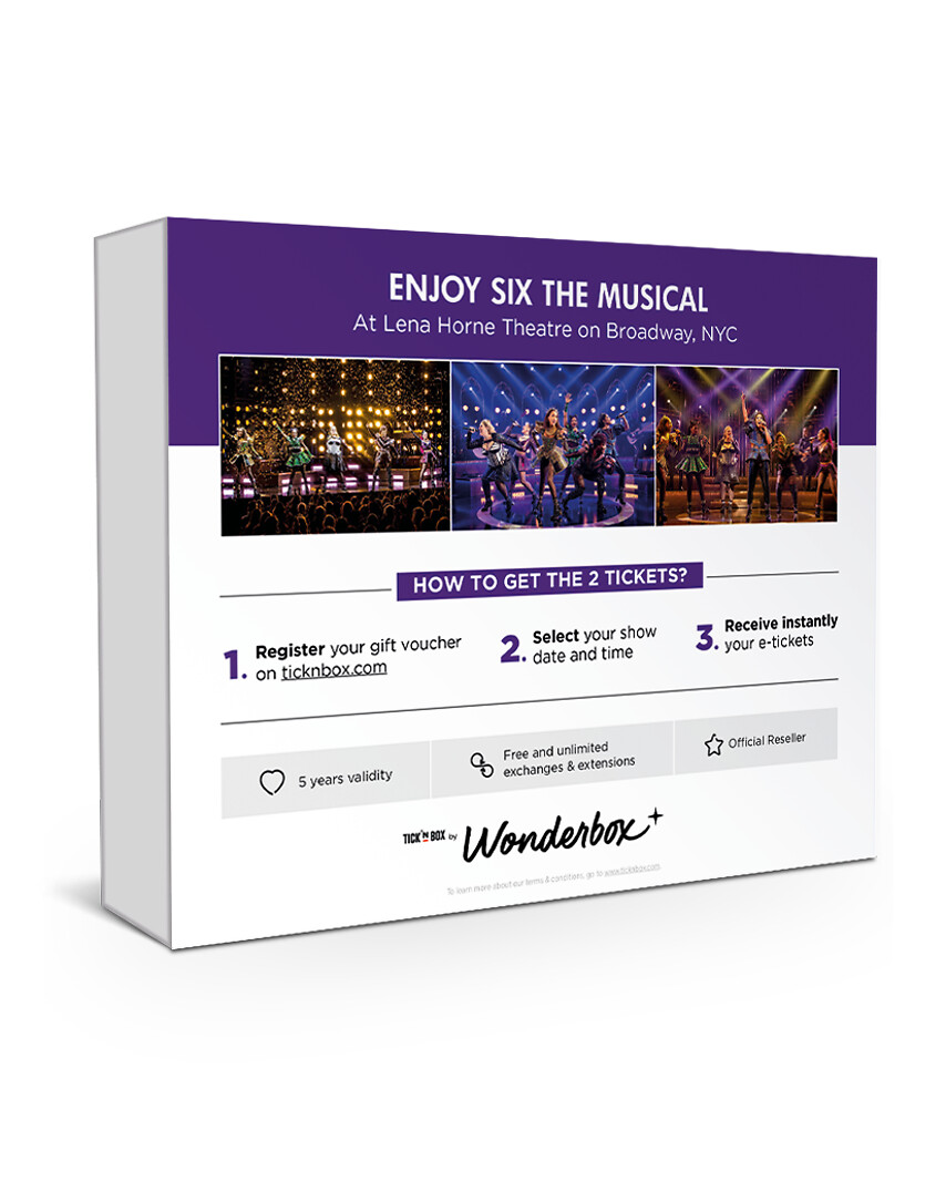 This experience gift includes two tickets and is about sharing the magic of storytelling, the power of live performance, and the joy of spending quality time together. Step into the dazzling world of Broadway with Wonderbox's exclusive gift experience featuring the electrifying show, "Six - The Musical." Prepare to be swept away by the captivating tale of six extraordinary women who take the stage to reclaim their identities and rewrite history. With Wonderbox's carefully curated gift, you'll receive two coveted tickets to this sensational musical that has taken the theater scene by storm. Delight in the enchanting fusion of history, pop, and modern-day storytelling as you witness the six wives of Henry VIII come to life with powerful performances, infectious energy, and show-stopping melodies. As the lights dim and the curtains rise, you'll find yourself immersed in a world where past and present collide in a whirlwind of music and dance. Marvel at the stunning choreography, awe-inspiring vocals, and the vibrant visuals that bring the Tudor queens' stories to vivid life on the Broadway stage. Wonderbox's Broadway experience isn't just about witnessing a show; it's about creating memories that will last a lifetime. Share the magic of "Six - The Musical" with a loved one or a dear friend as you both become part of the spellbinding narrative, singing along to the anthems and laughing at the witty, modern twists on history. Whether you're a seasoned theater enthusiast or a newcomer to the world of Broadway, this Wonderbox gift experience promises an unforgettable evening filled with laughter, empowerment, and the sheer joy of live performance. Immerse yourself in the world of "Six - The Musical" and let Wonderbox make your Broadway dreams come true.