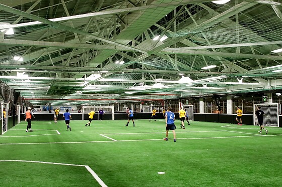 It is an indoor venue with state of the art turf. We allow indoor and turf shoes, no cleats for this meetup, the player safety is priority.