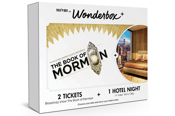 The beautiful box includes:+ prepaid voucher to redeem 2 open tickets for The Book of Mormon + One hotel night in NYC.+ notebook to keep memories of the unforgettable experience.