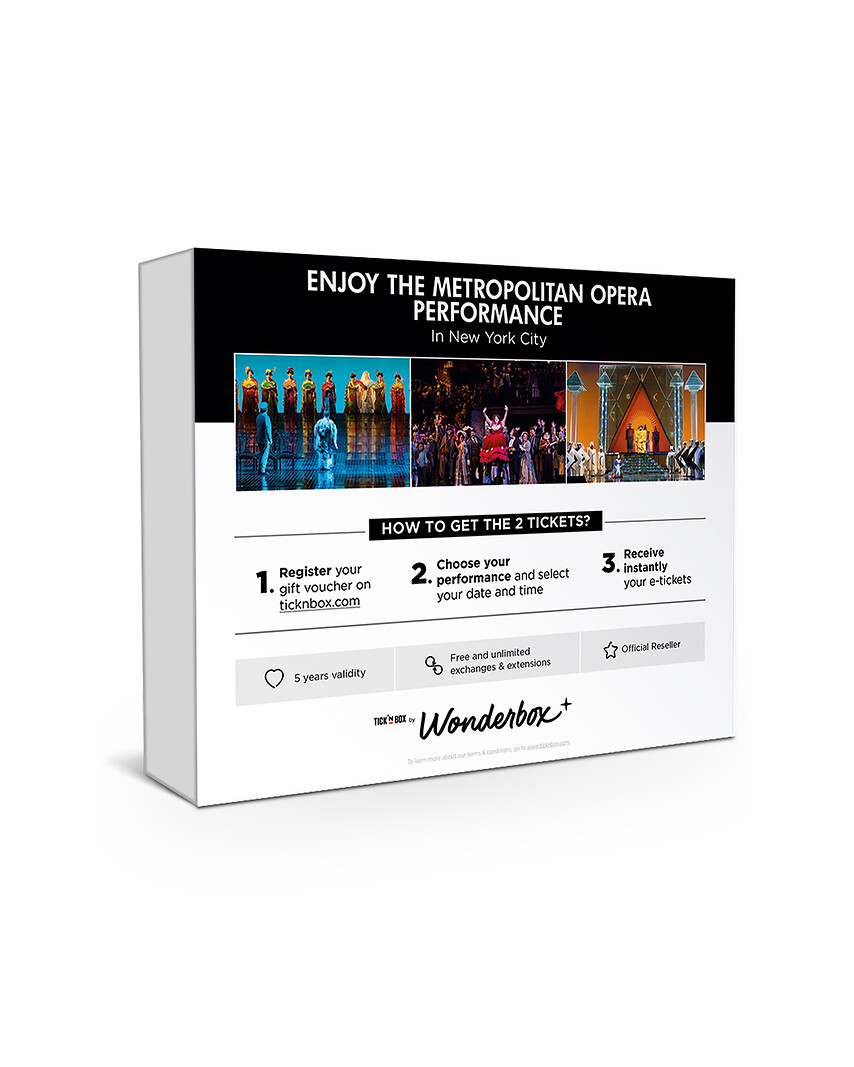 This experience gift includes two tickets and is about sharing the magic of storytelling, the power of live performance, and the joy of spending quality time together. Indulge in the grandeur of the performing arts with our exquisite Wonderbox gift experience, tailored exclusively for opera enthusiasts. Set against the iconic backdrop of New York City's cultural epicenter, this enchanting journey promises an unforgettable evening filled with elegance, passion, and the timeless beauty of opera. Your Wonderbox includes two coveted tickets to a spectacular opera show in the heart of the Big Apple. As you step into the opulent theater, you'll be greeted by the enchanting ambiance of the venue, where every detail has been meticulously designed to transport you to a world of high drama and artistic brilliance. Take your seats in the hushed anticipation of fellow aficionados, the dimmed lights heightening the sense of anticipation. The moment the curtains rise, you'll be swept away by the mesmerizing performances unfolding on stage. The resounding crescendos of arias, the intricate choreography, and the power of the human voice will envelop you, transcending time and place. Marvel at the intricate costumes and elaborate set designs that bring the opera's narrative to life. From tragic love stories to heroic tales, each production promises a unique and emotionally charged experience, leaving you spellbound by the sheer artistry on display. During intermission, you can savor a glass of fine wine or champagne, engaging in conversations about the performance with fellow opera aficionados. As the evening progresses, you'll find yourself drawn deeper into the immersive world of the opera, as the talented cast and orchestra transport you through a range of emotions. This Wonderbox gift experience is a journey into the heart of culture, where music, storytelling, and visual artistry combine to create an unforgettable night in the city that never sleeps. Whether you're a seasoned opera lover or a newcomer eager to be captivated, our Opera Show in NYC Wonderbox is your gateway to an evening of pure artistic enchantment. Immerse yourself in the enchanting world of opera in New York City with our Wonderbox gift experience. It's not just a night at the opera; it's an unforgettable odyssey into the heart of the performing arts, a cherished memory waiting to be created.