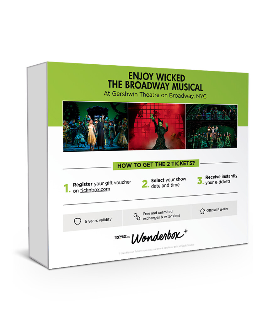 About "Wicked The Musical - 2 Tickets" gift: Immerse yourself in the fascinating world of Wicked The Musical, one of Broadway’s greatest hits. With the "Wicked The Musical 2 Tickets" gift box, treat yourself to a magical evening at the Gershwin Theatre, where the story of Elphaba and Glinda comes to life through breathtaking sets, an unforgettable soundtrack, and mesmerizing performances. This iconic show, which has captivated millions of spectators worldwide, reimagines the world of The Wizard of Oz from a whole new perspective. Whether you're a musical theater enthusiast or discovering an award-winning production for the first time, this exclusive Broadway Show pass guarantees an immersive and unforgettable experience. What happens on the day ? Looking for a unique gift idea for a Broadway lover? The "Wicked The Musical 2 Tickets" gift box is the perfect way to give more than just a ticket : it’s a theatrical experience like no other. With this exclusive show pass, enjoy premium benefits: Access to the best seats for full immersion in the world of Wicked. Choose your preferred date from a wide selection of performances. Enjoy the experience as a duo, perfect for a night out with friends, a romantic date, or a family outing. Extend the magic with the option to stay at a nearby hotel for the ultimate Broadway experience. With over 10 million spectators since its debut, Wicked remains a must-see production, captivating audiences with its spellbinding story and spectacular staging. Whether it’s for a birthday, Christmas, Valentine’s Day, or simply to gift a moment of escape, the "Wicked The Musical 2 Tickets" gift box ensures a magical evening in the heart of Broadway.