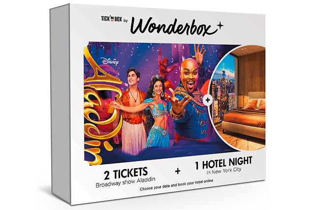 Inside the experience gift box? The box includes a prepaid voucher to redeem 2 tickets for Aladdin & 1 hotel night in New York City + a notebook to keep memories of the unforgettable experience.