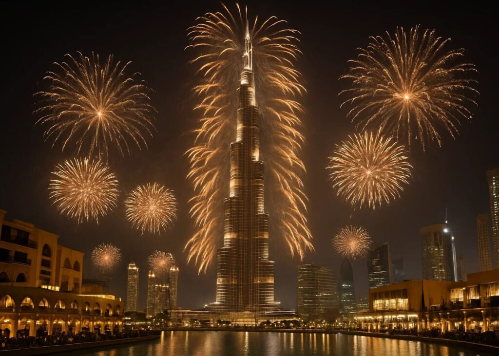 Fireworks surrounding the Burj Khalifa often combine pyrotechnics, laser projections, and synchronized fountain shows across Downtown Dubai.